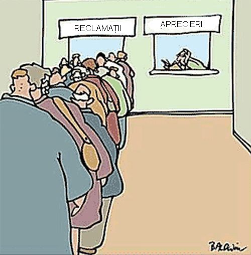 Imaginea asta ma face sa ma intreb ce-o fi in mintea acelor oameni care stau la coada. Cred ca una din dorintele lor cele mai mari este ca ghiseul din dreapta sa fie tot pentru RECLAMATII. Reclamatiile mereu sunt fara numar, pe cand aprecierile… lasa de dorit.