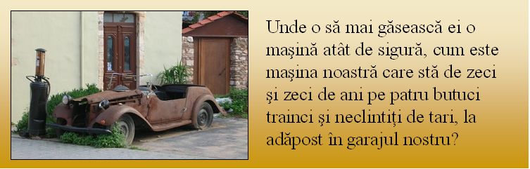 De când au laptop-uri, copiii au început să se uite la maşini noi. Sunt infestaţi domnule, de tot feluri de bloguri şi reclame. Cert este că de la o vreme pluteşte aşa o nemulţumire mocnită în maşina noastră, mai ales la călătoriile noastre de duminică seara. Nu-i mai pot motiva nici măcar să şteargă geamurile maşinii. Aproape că nu mai vedem afară. Îi aud şuşotind unul la urechea celuilalt. Mă tem c-o să rămân numai eu cu Veta în maşină. Nu pot înţelege în ruptul capului, ce mai vor şi tinerii de azi? Nu mai sunt mulţumiţi cu maşina noastră, istorică, albastră şi sigură. Mai ales, sigură. Cea mai sigură maşină din lume, cu care nimeni n-a făcut vre-un accident vreodată. N-am călcat o găină în viaţa mea. N-am stropit un pieton. Unde o să mai găsească ei o maşină atât de sigură, cum este maşina noastră care stă de zeci şi zeci de ani pe patru butuci trainci şi neclintiţi de tari, la adăpost în garajul nostru? Patru temelii tari ca cele patru evanghelii.