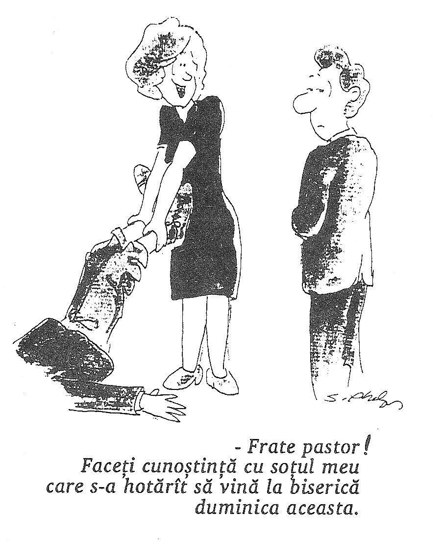 Cred ca de-aici lipseste elementul esential al unei neveste credincioase: „Tot astfel, nevestelor…” ( I Petru 3:-8). Asta ar fi rezolvat multe, inclusiv imaginea reprezentativa, cu mult sub demnitatea duhvniceasca a surorii noastre scumpe…Cred ca fratele pastor a ramas perplex fata de o asa „initiativa” inedita, nestiind ce sa faca mai intai: sa mustre sau sa…felicite ! Dar pe cine, si de ce ?