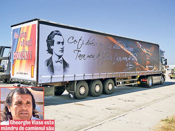 Reprezentanţii Autorităţii Rutiere Române au fost atât de surprinşi ieri la vederea TIR-ului, încât l-au oprit pe loc pe Autostrada Bucureşti-Piteşti pe conducătorul acestuia, Gheorghe Vlase. Omul nu depăşise viteza legală şi nu încălcase nicio regulă de circulaţie, ci doar a arborat pe prelata TIR-ului pe care-l conducea o imagine a poetului neamului românesc, Mihai Eminescu, alături de versurile „Ce-ţi doresc eu ţie, dulce Românie/ Ţara mea de glorii, ţara mea de dor!”, iar pe spatele maşinii îndemnul „Nu uita că eşti român!”