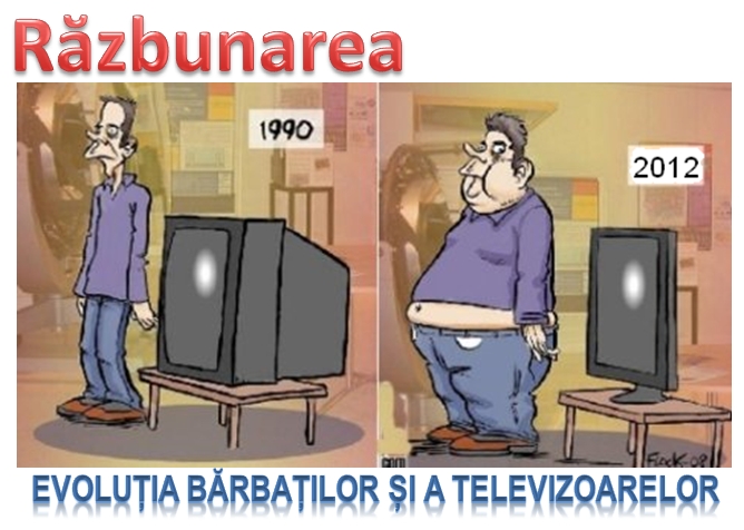 Asa am arata fiecare dintre noi dupa un regim special de stat in fata televizorului de 22 de ani . Ati auzit termenul de ” couch potato „. Stie ea sarmana pe cine are in casa . Proportia in care omul si televizorul evolueaza este una ciudata , ar fi frumos daca cele doua ar putea fi inversate . Ne mai miram ca sedentarismul duce la tot felul de boli . Cu riscul ca imi voi face ceva dusmani imi permit sa afirm ca acest comentariu se aplica la ambele sexe .