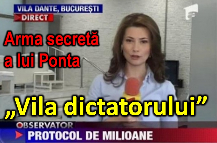 Cu o cheie obținută prin „ordonanță de urgență” a Interimarului care s-a cotrocit pe la Cotroceni, Ponta a invitat azi ziariștii și televiziunile să vadă cu ochii lor, vila doctatorului. Să vadă și să vedem și noi, care trăim în sărăcie și mizerie, mâncăm salam cu soia și ne luptăm așa ca tovarășul Ponta cu greutățile vieții, să vedem deci în ce lux se scălda (adică voia să se scalde) dictatorul după ce ieșea din slujbă.