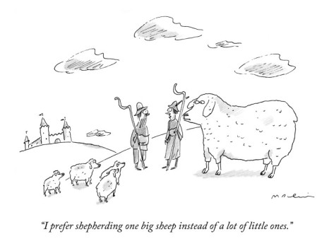 Nu cred că lâna și laptele ar fi mai valoroase de la o oaie mare decât de la mai multe mici… Cred că sunt mai periculoase pentru cioban. Devine dependent de oaia lui cea mare… care va ajunge să-l păstorească ea pe cioban.